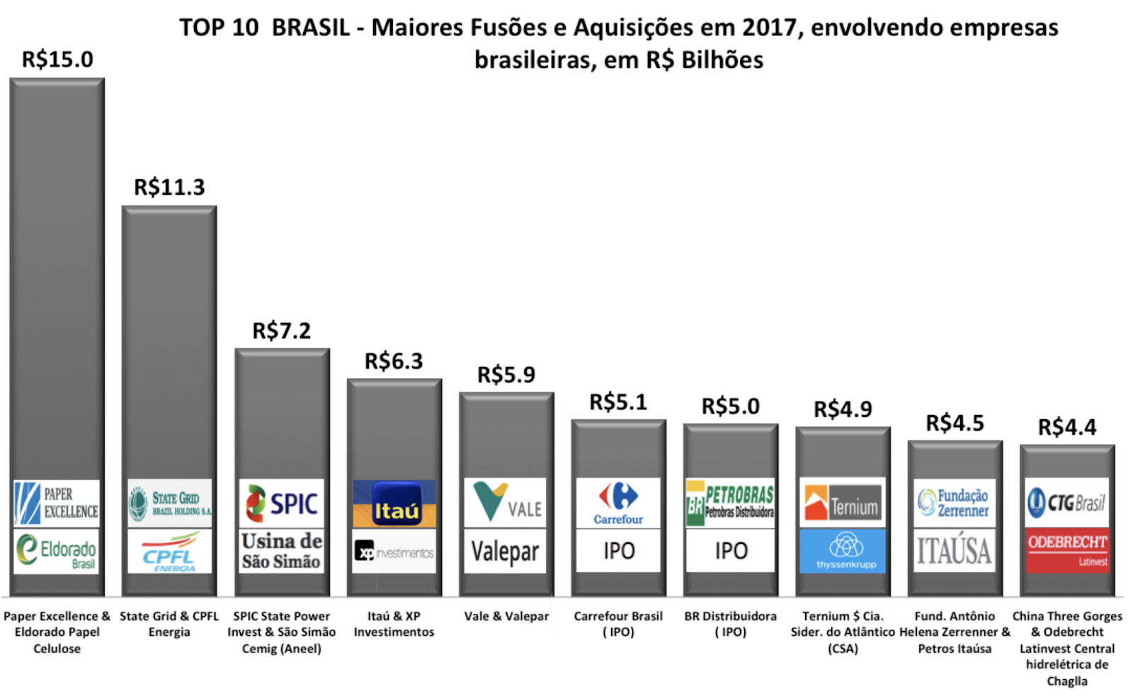 Em 2018, foram realizadas 58 operações com porte acima de R$ 1,0 bilhão, uma queda de 9,4% do número de operações em relação ao ano anterior, e corresponde a um investimento da ordem de R$ 201,4 bilhões, representando um crescimento de 13,7%.