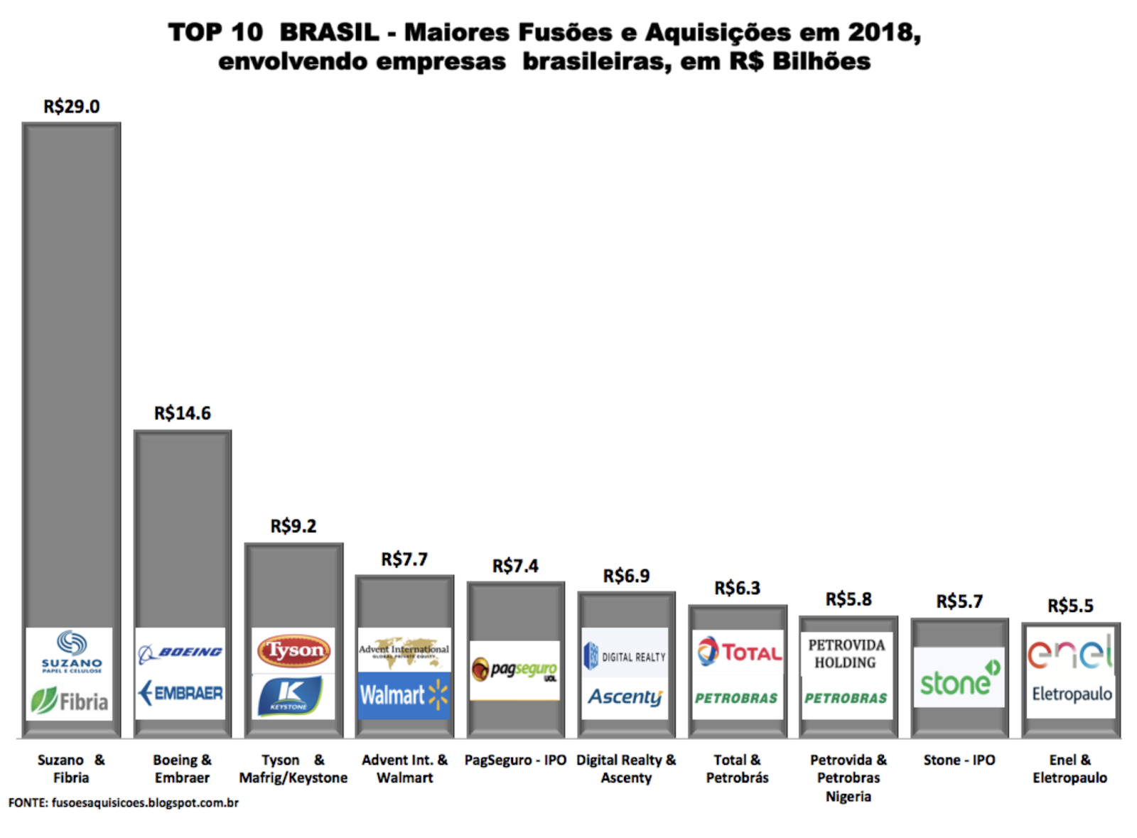 As 10 maiores transações de M&A realizadas em 2019, envolvendo empresas brasileiras – com valores divulgados, em levantamento realizado pelo blog fusoesaquisicoes.blogspot.